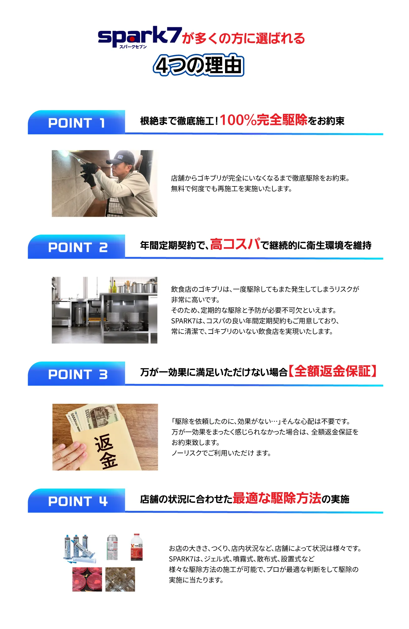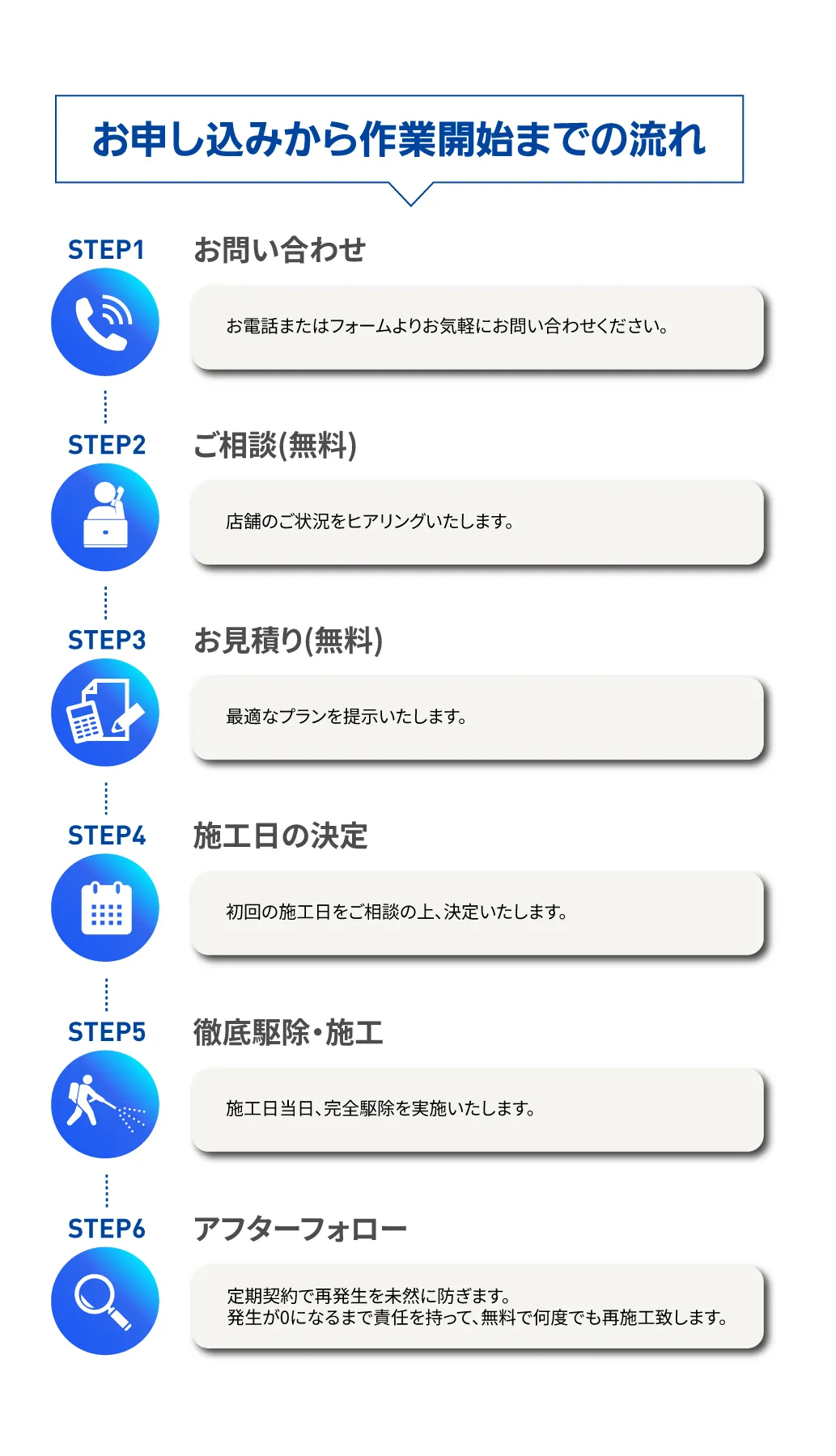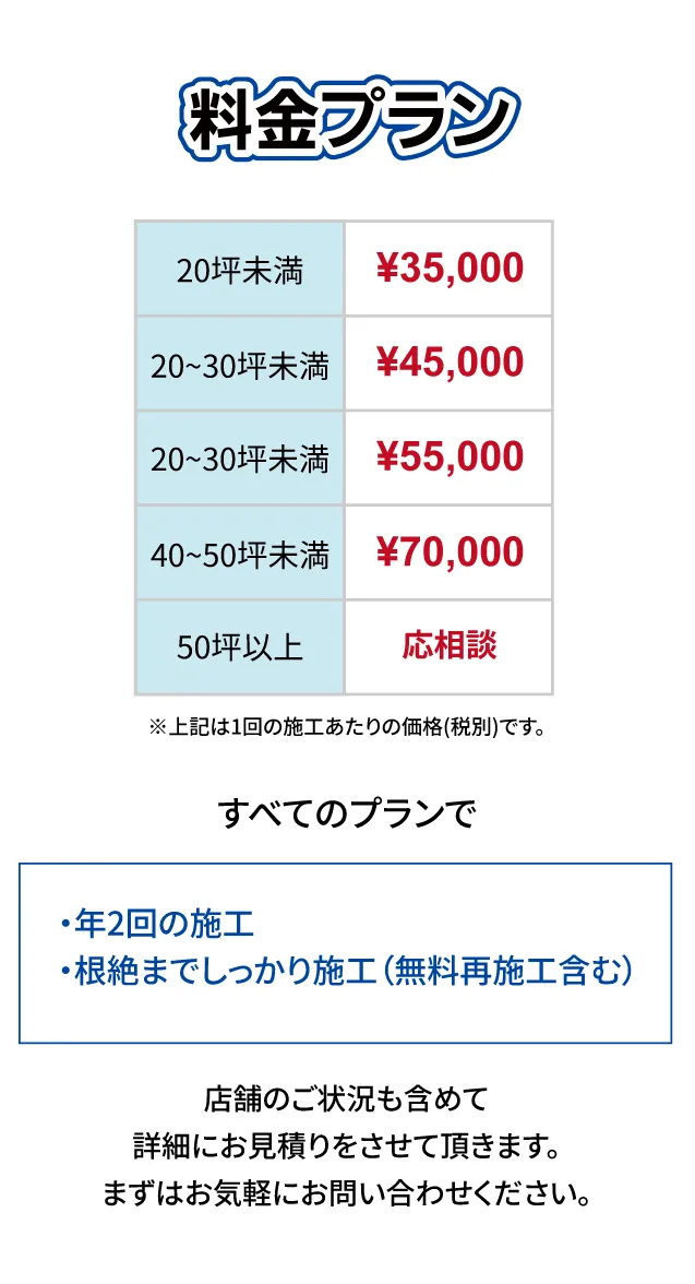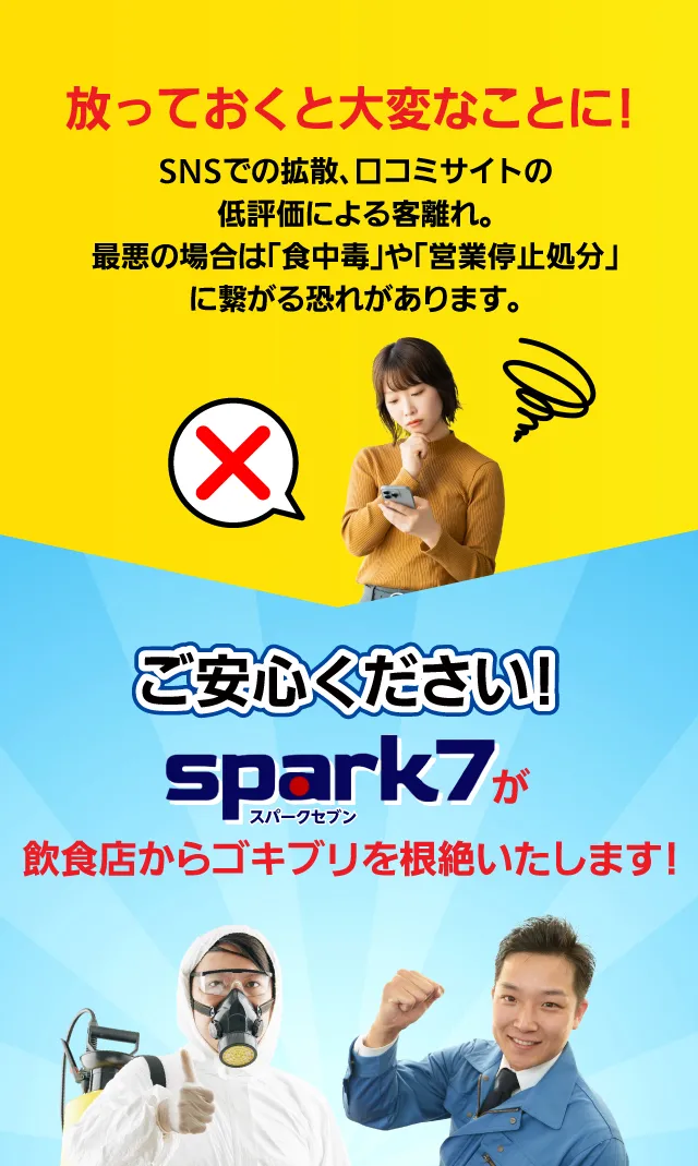 私たちは単なる「薬剤散布」ではありません。 「発生源の特定」×「最適な薬剤の選定とかけ合わせ」により 巣ごと全滅させ、再発生を徹底的に防ぎます。 さらに、年2回の定期的な施工で、 『ずっとゴキブリのいないお店』を実現いたします!