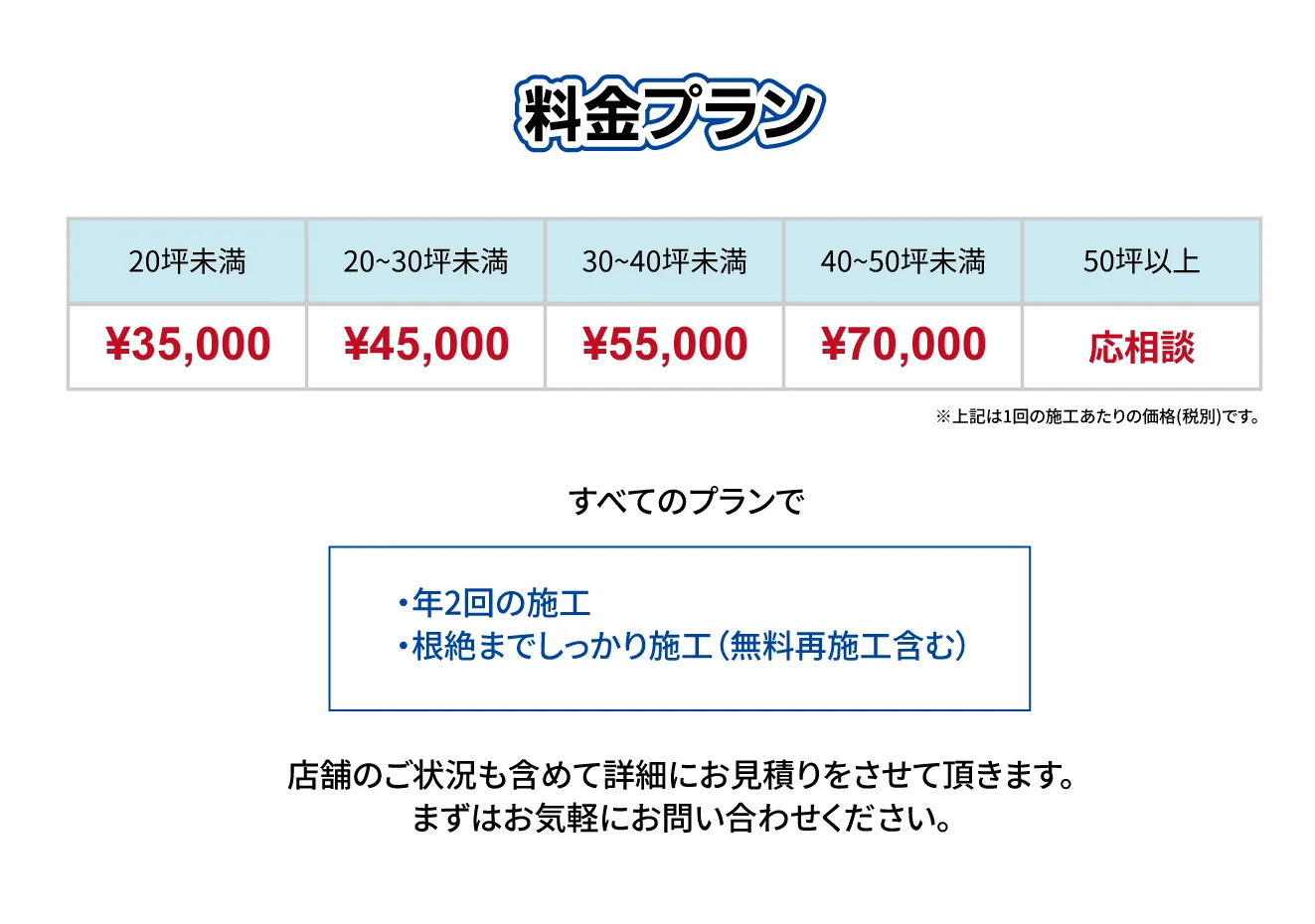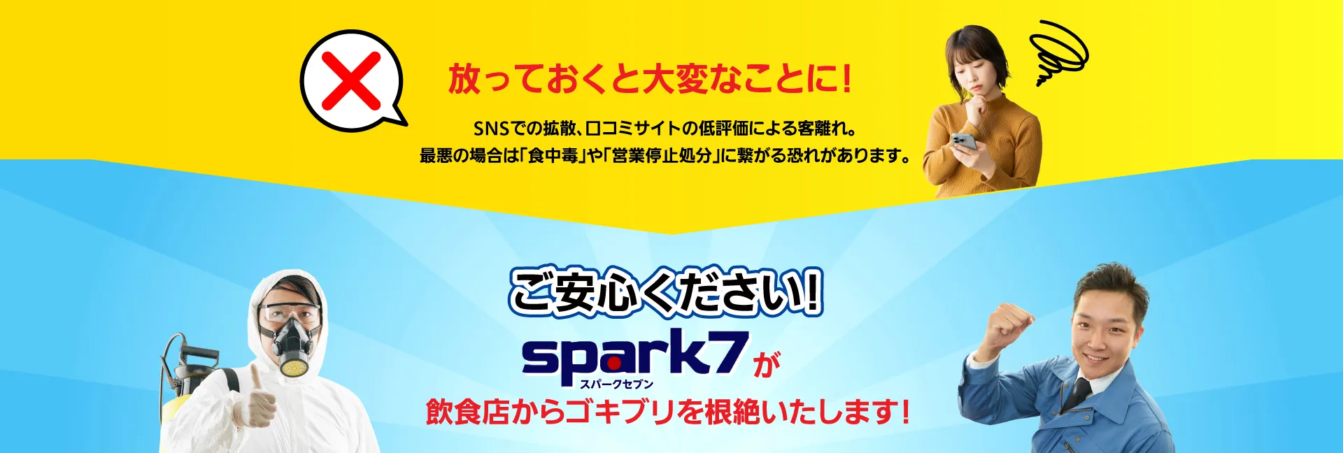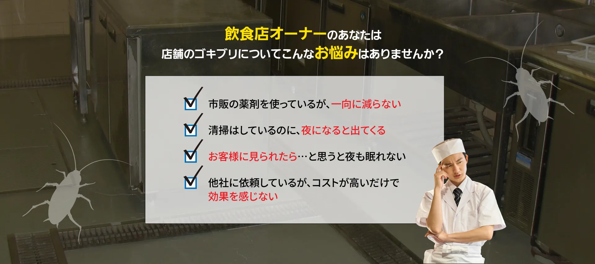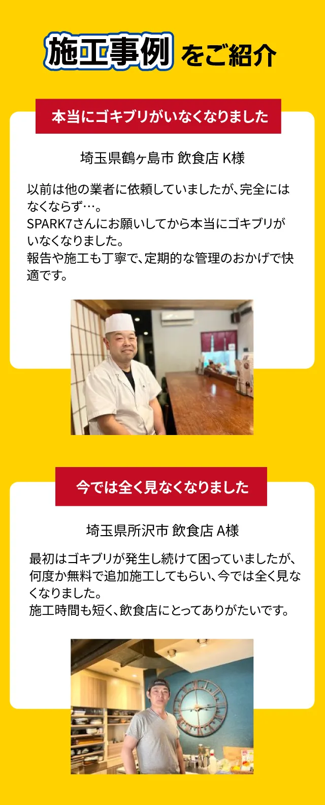 私たちは単なる「薬剤散布」ではありません。 「発生源の特定」×「最適な薬剤の選定とかけ合わせ」により 巣ごと全滅させ、再発生を徹底的に防ぎます。 さらに、年2回の定期的な施工で、 『ずっとゴキブリのいないお店』を実現いたします!